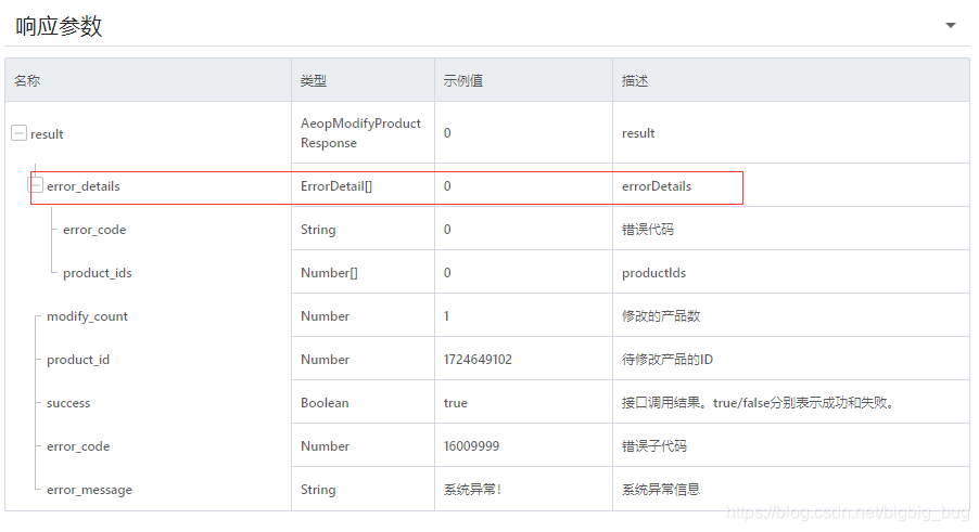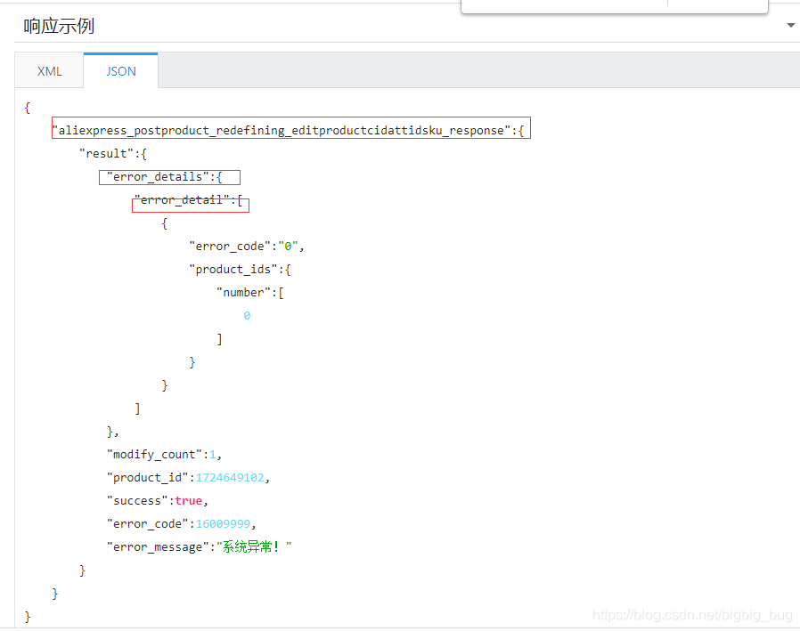 返回请求参数数据结构体设计,这里是个重点,但凡你请求速卖通返回的数据结构,和你设计的数据结构有一点不一样,就不能通过奇门的数据转发,所以你不仅要参考速卖通api文档上的响应参数,还要参考下面的响应示例,应为实际返回的数据结构和api文档上结构有部分不一致