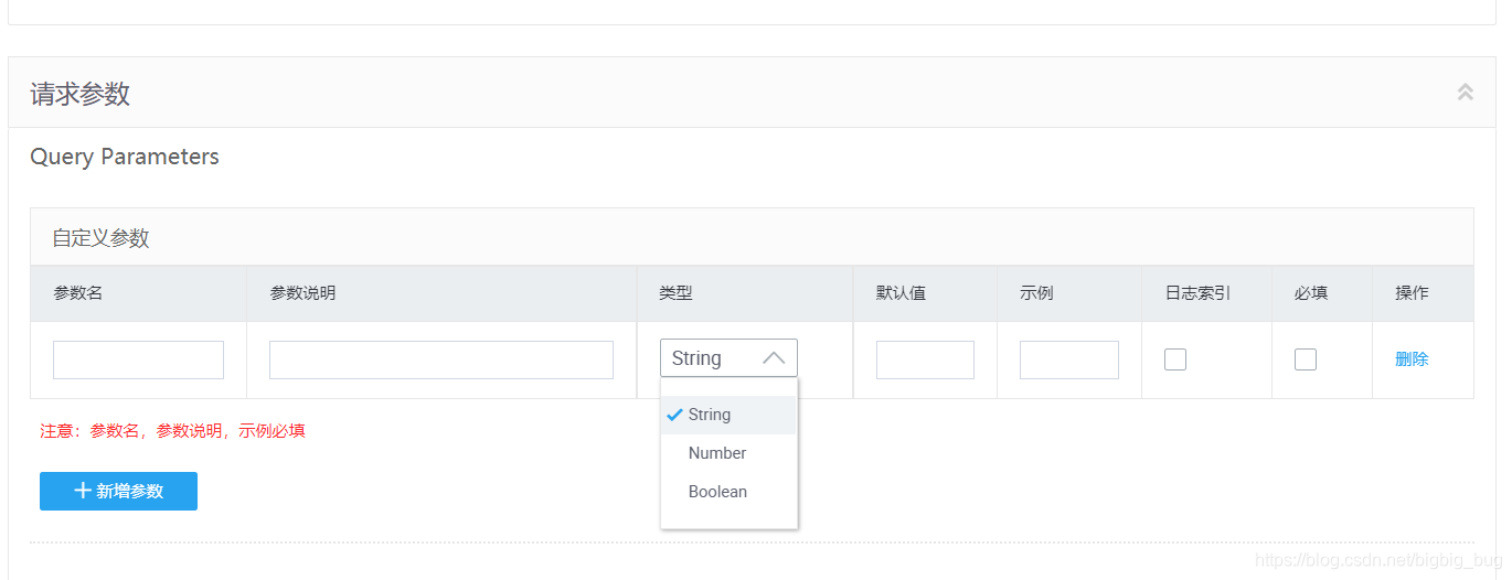 请求参数,这个是请求链接后面拼接的参数,我是懒省事。直接在这里写了,但是数据类型只有这三个,简单的请求参数可以在这写,对照速卖通的api文档进行复制吧,注意空格,有空格保存不了的,需要一个示列, 填好方便后面测试