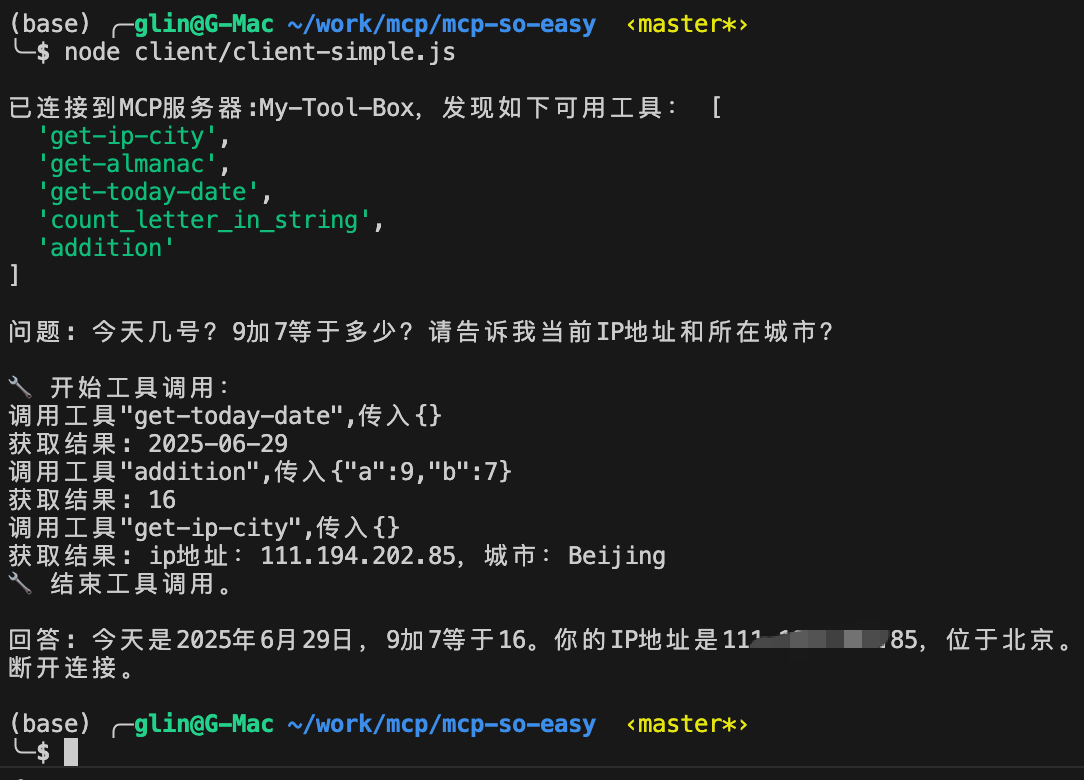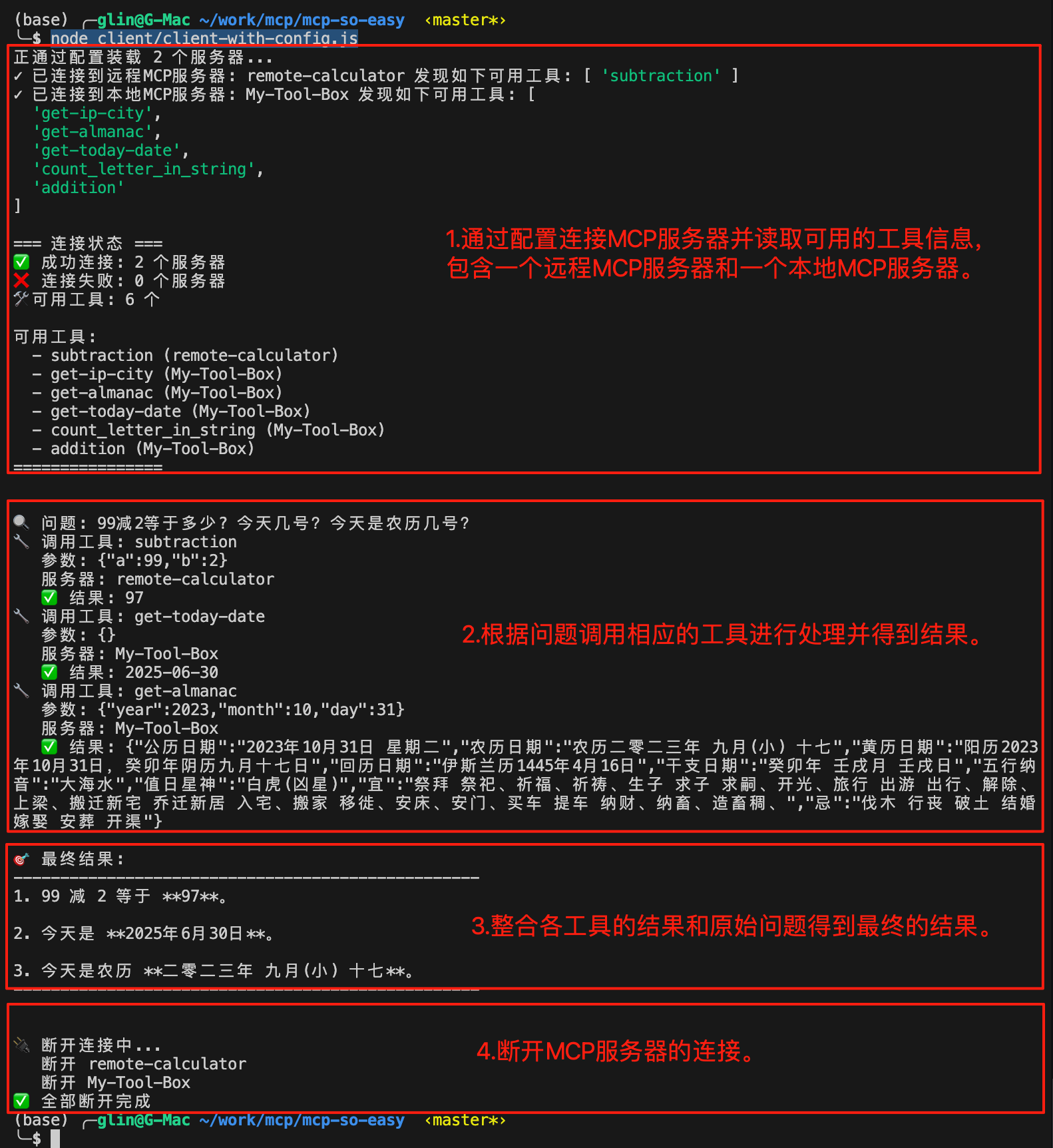 从上图我们可以看到:MCP客户端连接到了名称为"My-Tool-Box"的MCP服务(不了解的可以看我上一篇MCP服务端实现的文章)并发现了5个工具函数。问题中包含3个子问题,分别调用了3个对应的工具得到3个对应的结果,然后整合输出完整回答。最后断开连接。