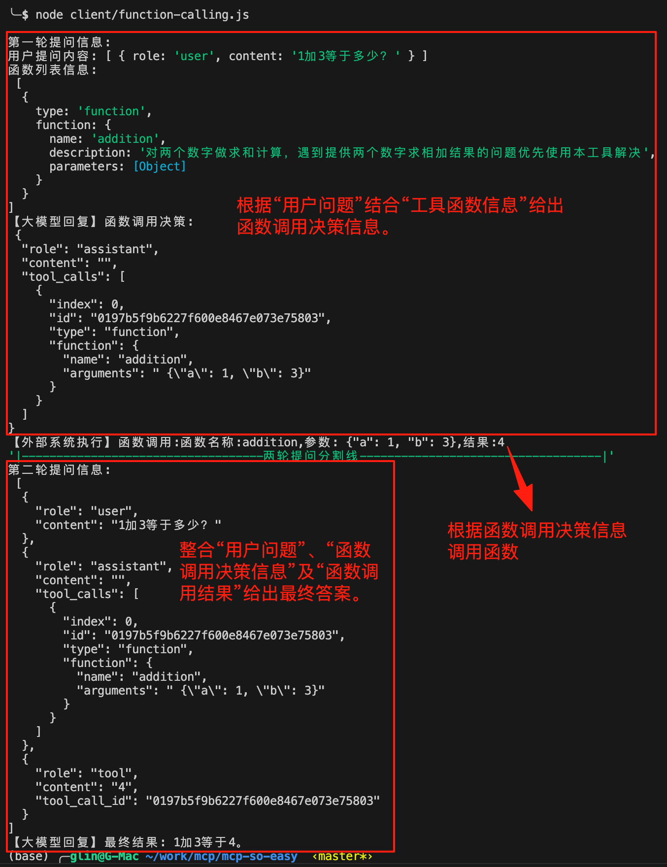 对比function-calling.js 和client-simple.js的代码可以看出来,前者实现的是简单的大模型调用工具函数的过程。而后者实现了一次完整的MCP协议的交互的过程,其中包含client(客户端)、server(服务器)、connect(连接)等高级抽象概念的应用。