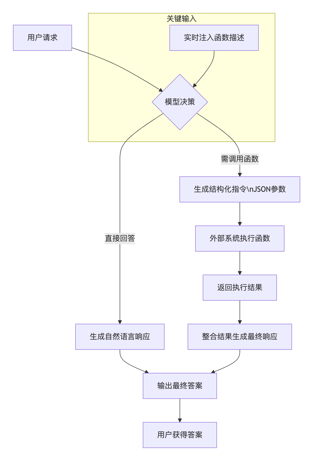 模型结合实时注入的工具描述(如函数名称、参数格式)动态生成调用指令,再由外部系统执行,最终整合输出结果。