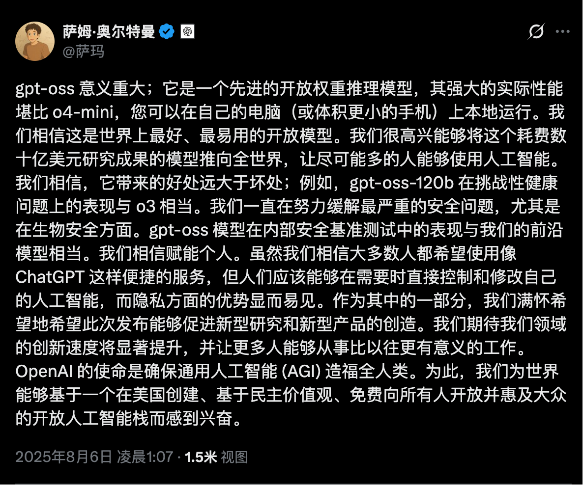 今天北京时间凌晨1点Sam Altman在社交媒体上连发了两个帖子: OpenAI终于把答应的开源兑现了!重点:电脑,甚至手机都能跑! 我们来看看OpenAI官网的上的信息: 可以看到这次开源的模型是:gpt-oss-120b 和 gpt-oss-20b 模型性能: 模型参数: OLLama支持: 其他介绍: Apache 2.0 许可协议、专业为智能体任务设计、可微调、支持完整思维链查看。 最后看看来自老马的嘲讽: