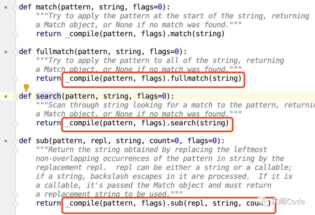 然后Windows用户按住键盘上的Ctrl键,鼠标左键点击 search,Mac用户按住键盘上的Command键,鼠标左键点击 search,PyCharm会自动跳转到Python的re模块。在这里,你会看到我们常用的正则表达式方法,无论是 findall还是 search还是 sub还是 match,全部都是这样写的: