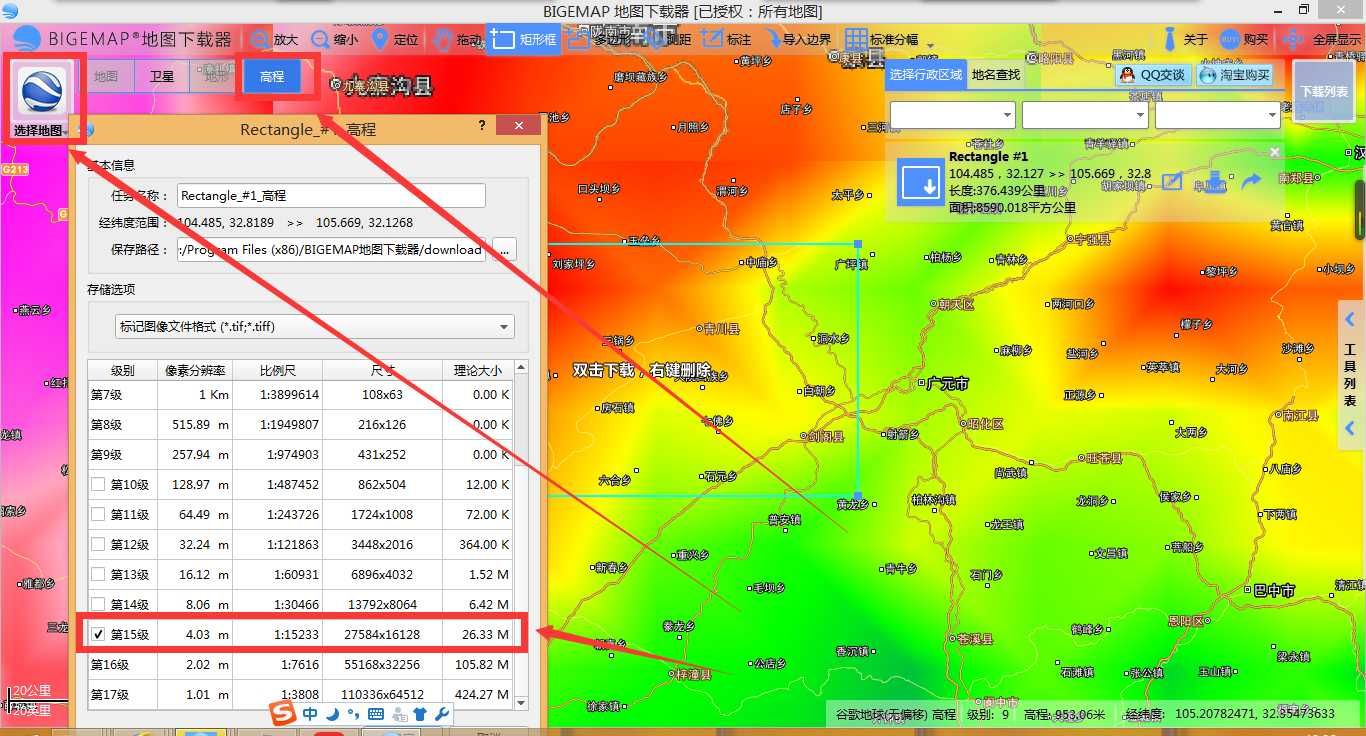 4. 选择下载的级别,建议尽量下载16级的,16级为最好级别。如果16级不能勾选,请选择下载小一点的范围,高程为矢量数据,超过20M大小,一般电脑都很难处理生成的等高线。下载之后的数据为tiff格式,实际为dem高程数据。