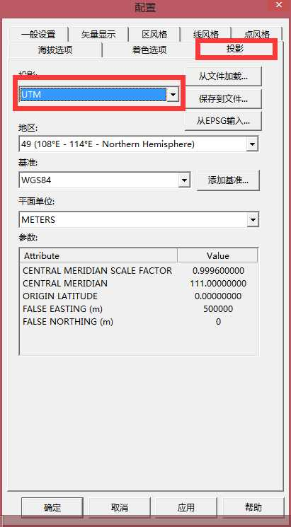 10 . 网格显示,由于下载的高程数据默认的是经纬度坐标,网格需要将投影转成xi'an80或者beijing54以大地坐标系的方式来显示网格【投影转换】;如果要用WGS84,则直接选择UTM,在选择对应的【分度带】;即变成XY坐标,单位为米。选择:【工具】->【设置】,选择里面的投影,选择【UTM】,如下图所示: