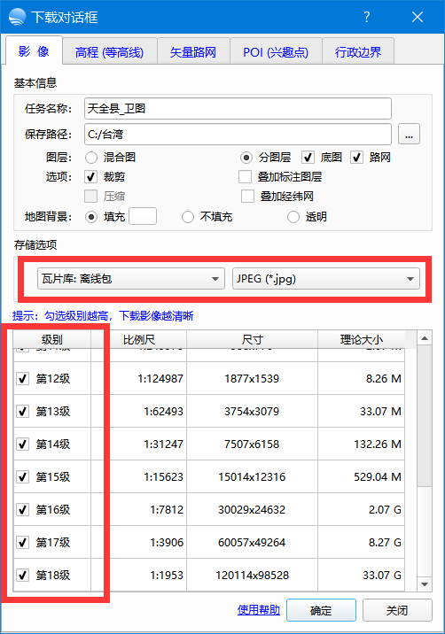 上图中,主要是选择 存储选项 : 瓦片库:离线包 ;然后 级别:全部勾选,然后点确定。