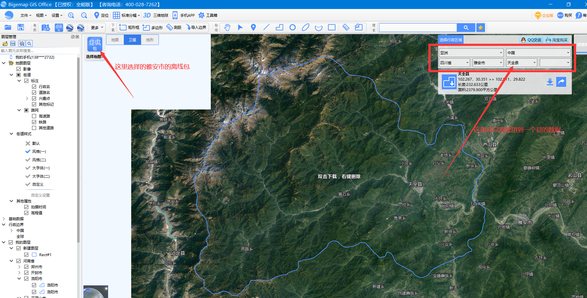 以本示例雅安为例: 添加了雅安的离线包,然后右上角我选择了 天全县 是我要的数据重新组织离线包