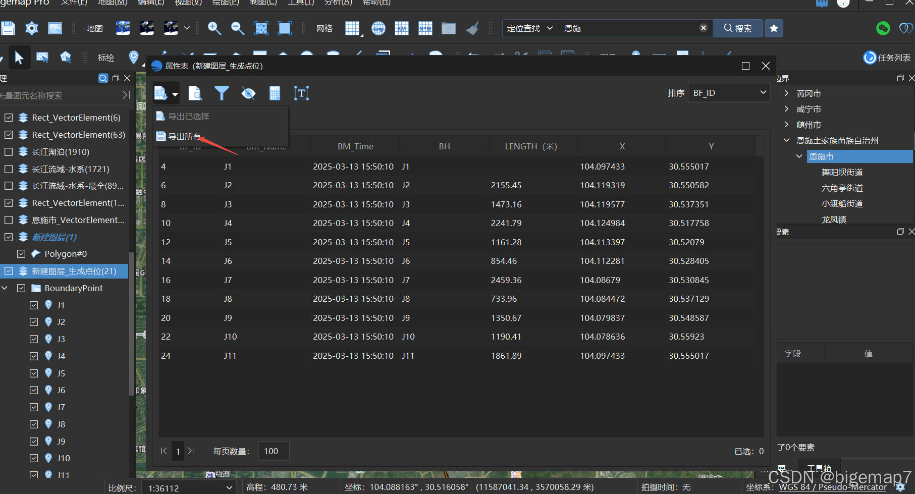 里面我们可以看到点位的值,还有两个界址点之间的线段长度,还有界址点的经纬度坐标,我们可以进行一个导出