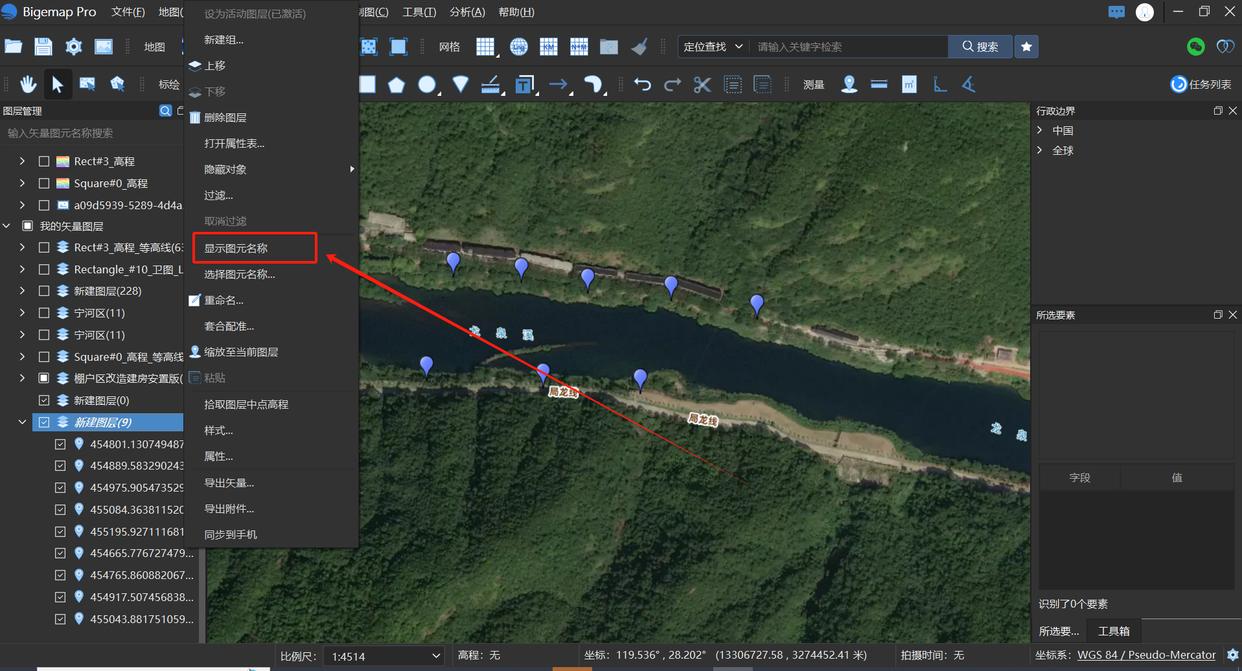 选中图层,鼠标右键,显示图元名称