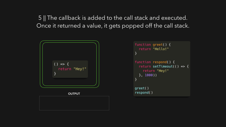 在上图的JavaScript代码中,respond()函数返回一个setTimeout()函数。setTimeout()是由Web API提供给我们的:它让我们可以延迟执行一项任务,而不会阻塞主线程。我们传给setTimeout()函数的回调函数(即箭头函数() => { return 'Hey' })被添加到Web API中。同时,setTimeout()函数和respond()函数从栈中弹出,因为它们都返回了它们的值!