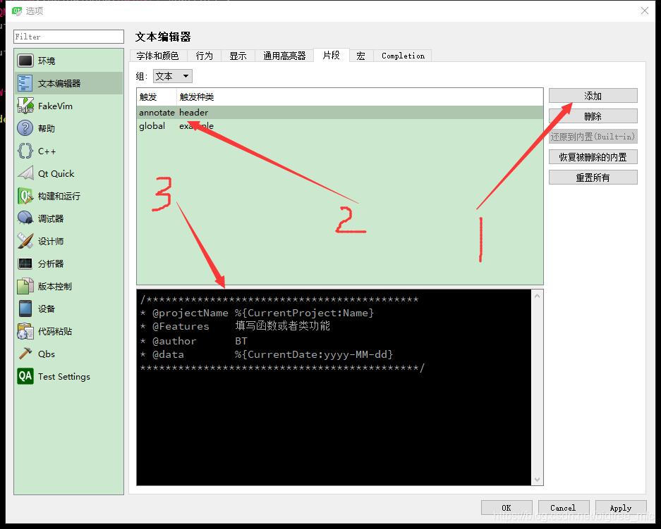 工具菜单->选项->文本编辑器->片段选项卡