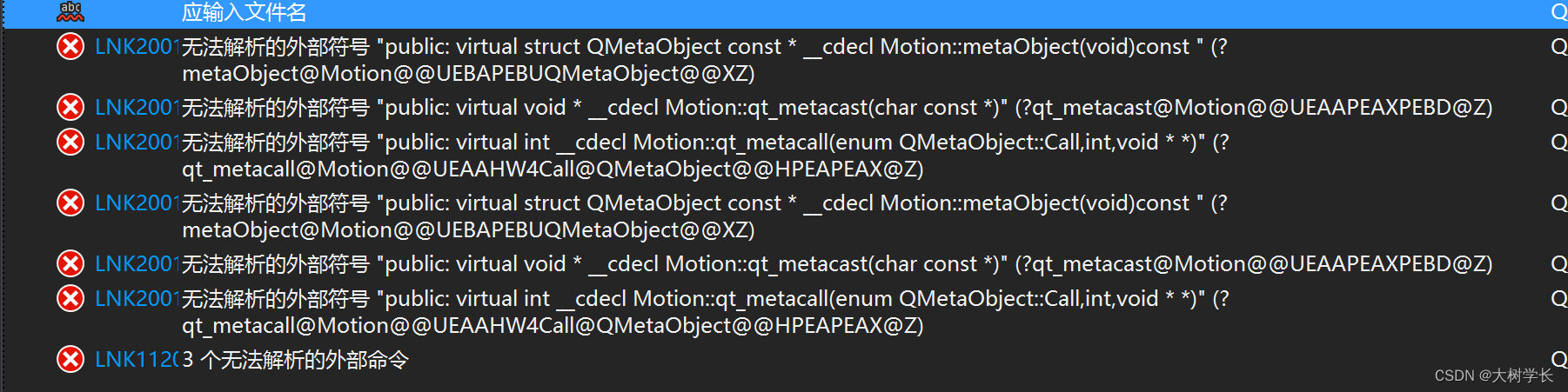 错误 LNK2001 无法解析的外部符号 "public: virtual struct QMetaObject const * __cdecl Motion::metaObject(void)const " (?metaObject@Motion@@UEBAPEBUQMetaObject@@XZ) QBatteryTesting F:\CT\source\QBatteryTesting\QBatteryTesting\Motion.obj 1