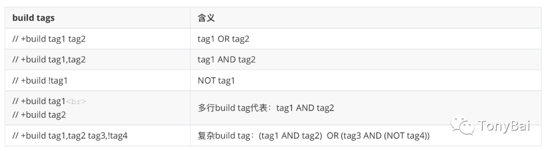 这种与程序员直觉“有悖”的形式让Gopher们十分痛苦,于是Go 1.17回归“正规”,引入了//go:build形式的构建约束指示符[6],这样一方面是与源文件中的其他指示符保持形式一致,比如: //go:nosplit、//go:norace、//go:noinline、//go:generate等。另外一方面,新形式将支持&&和||逻辑操作符,对于程序员来说,这样的形式就是自解释的,我们无需再像上面那样列出一个表来解释每个指示符组合的含义了,如下代码所示: