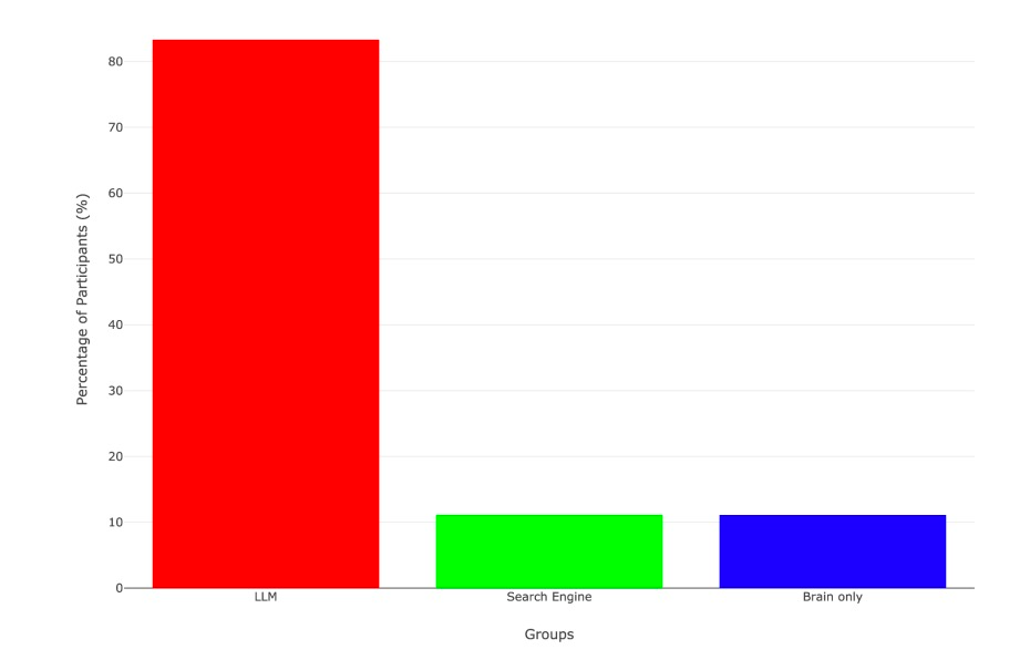 在 LLM 组中,83% 的参与者在写完论文后,几乎无法复述出自己文章中的任何观点(见下图)。而在另外两组,几乎每个人都能做到。