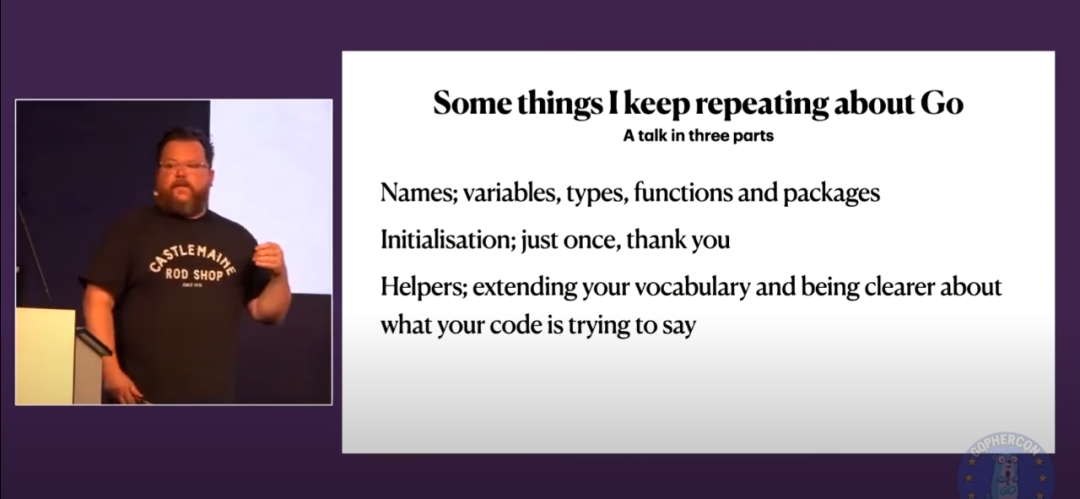 “我们应该执着地、狂热地关注程序中使用的每一个名字。” 演讲开篇,Dave 便直指编程的核心——命名。它涵盖了变量、常量、包、类型、方法和函数,是代码清晰度的源头。