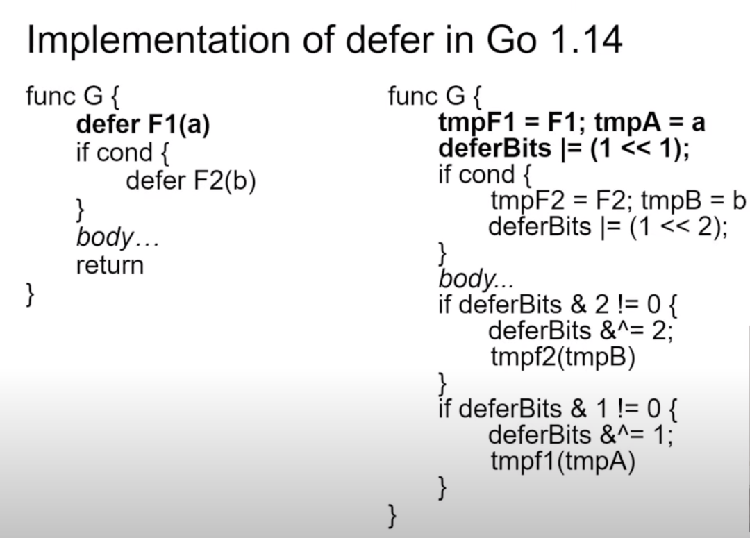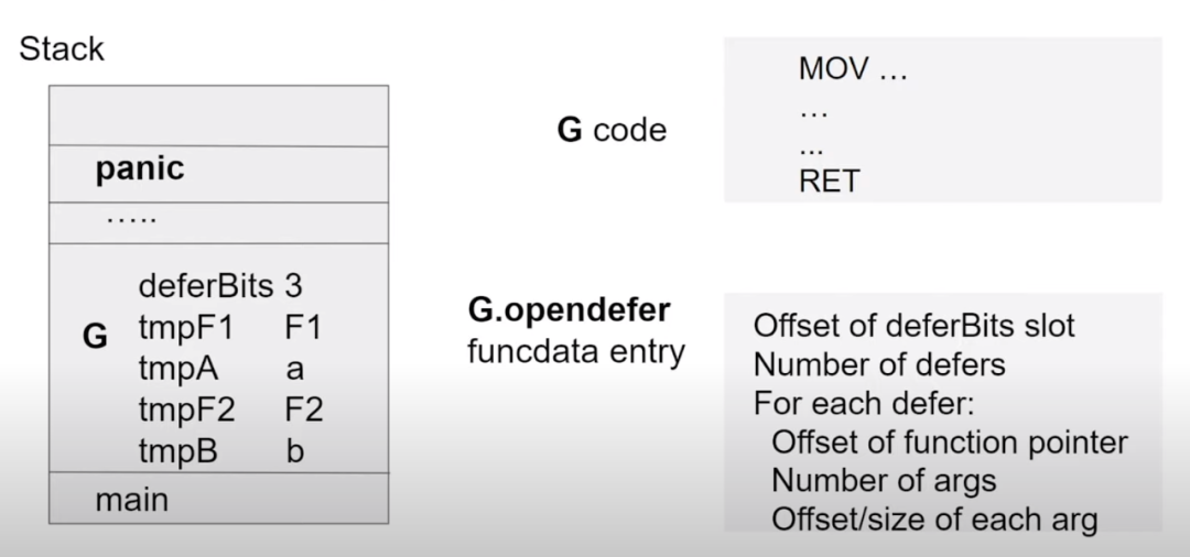 defer调用的函数指针和参数预留“专属”的存储位置。位掩码(Bitmask): 同样在栈上,引入一个