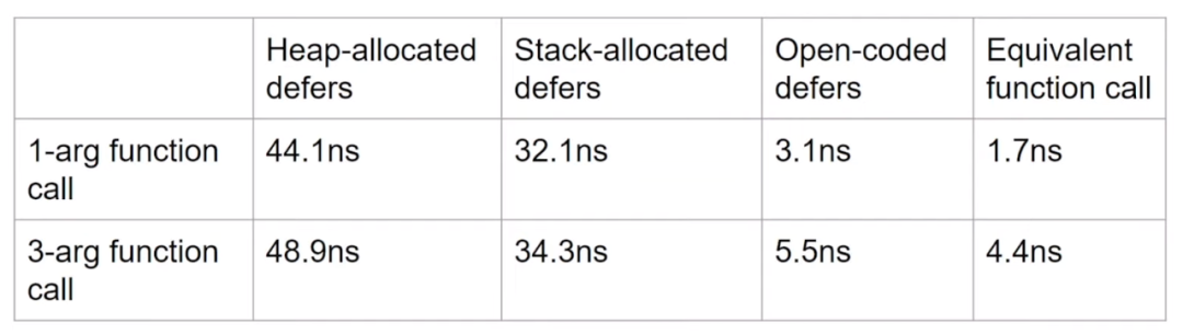 下面是Dan Scales给出的一个defer性能对比结果: