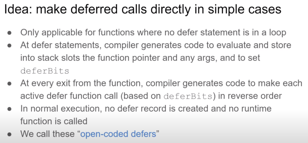 其核心思想是:对于那些简单的、非循环内的 defer,我们能不能彻底摆脱 runtime,让编译器直接在函数内生成所有清理逻辑?