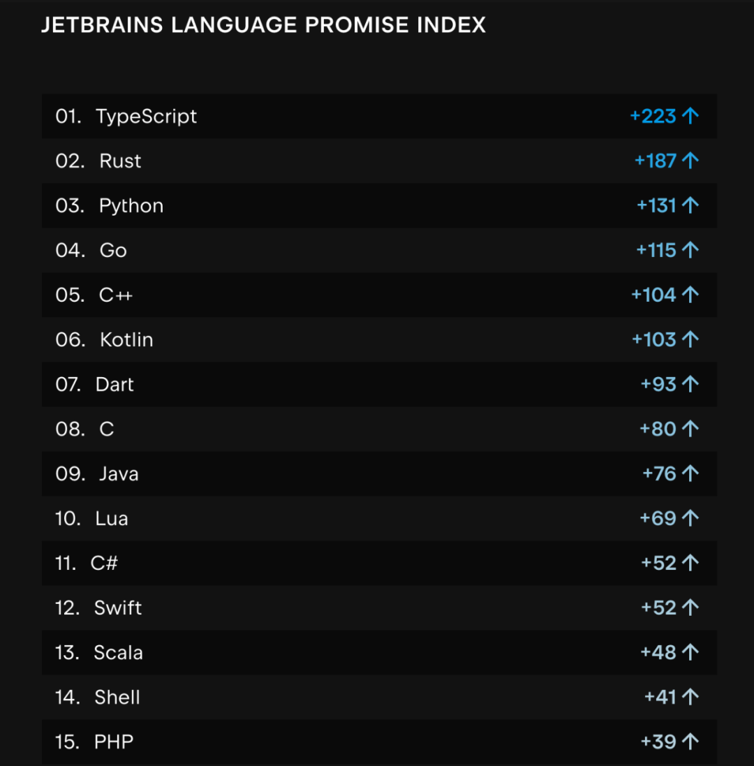 JetBrains 创设的“语言承诺指数 (Language Promise Index)”综合评估了语言的增长稳定性、采用势头和用户忠诚度。在这个极具前瞻性的榜单上,Go 以 +115 的高分位列第四,与 TypeScript (+223)、Rust (+187) 和 Python (+131) 共同组成了未来增长潜力最强的“第一梯队”。