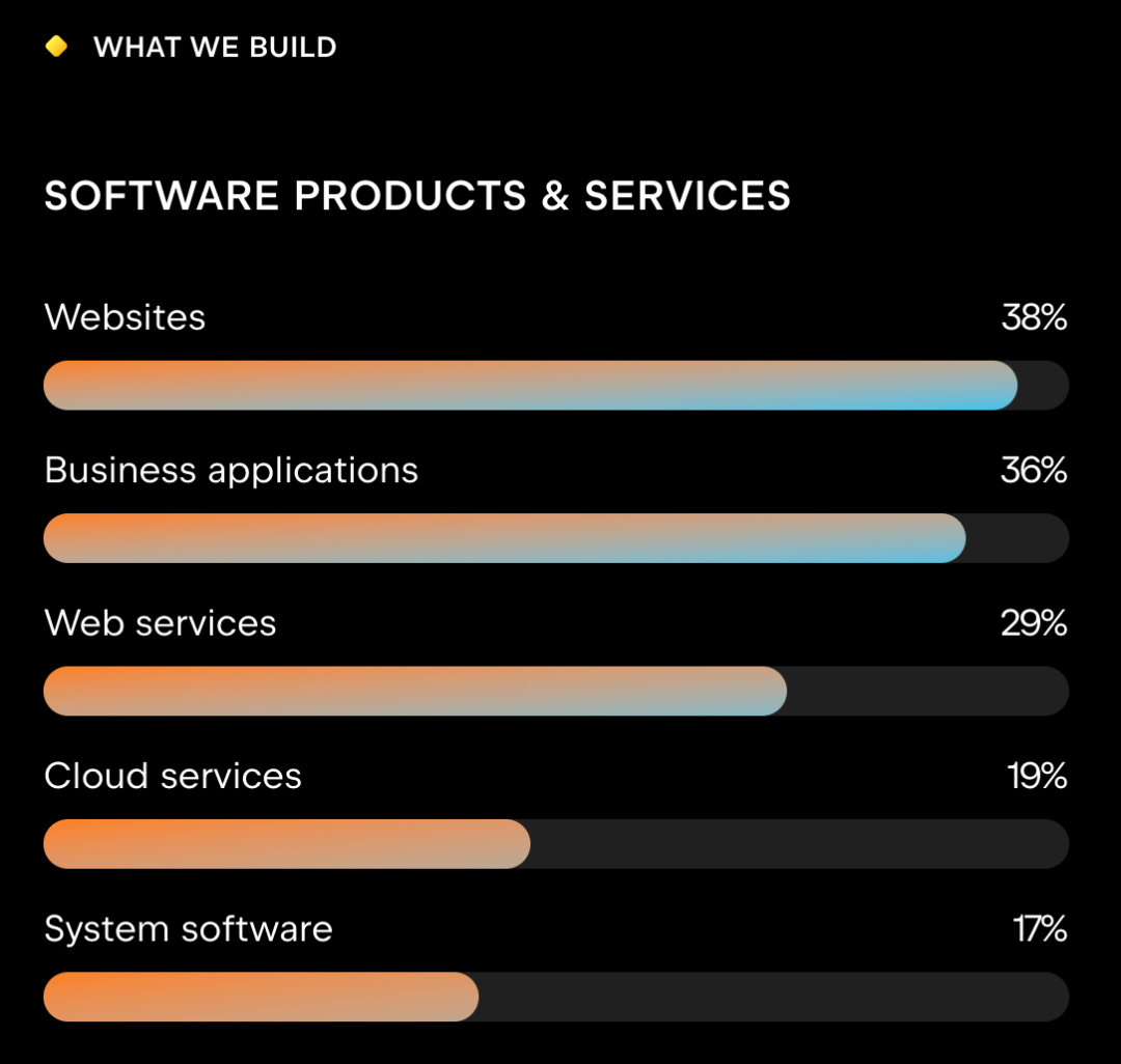 同时,在开发者构建的软件产品类型中,Web 服务 (29%)、Cloud 服务 (19%) 和 System software (17%) 占据了重要份额。