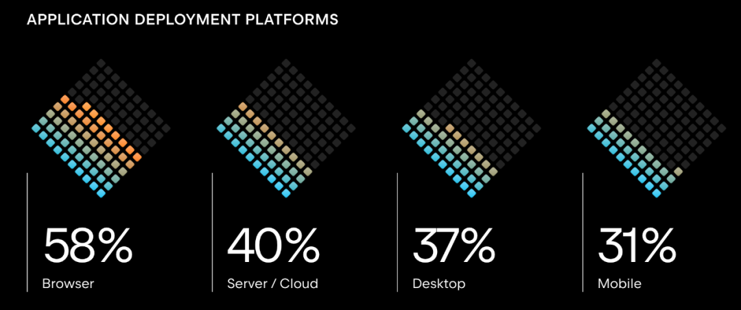 在应用部署平台方面,40% 的应用被部署在服务器/云端,这是仅次于浏览器的第二大平台。在云服务提供商方面,AWS (43%)、GCP (22%) 和 Azure (22%) 占据了市场主导地位。