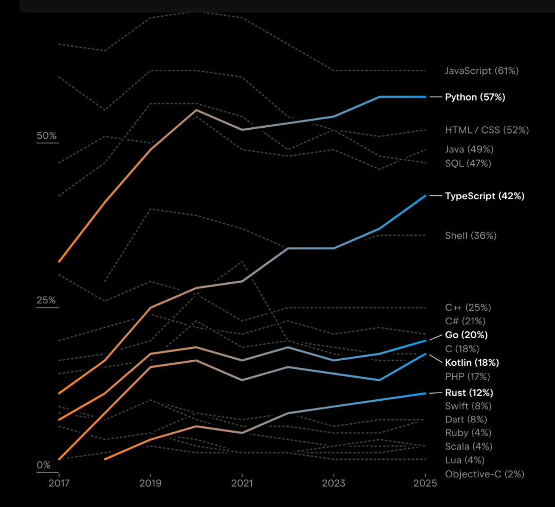 这是一个非常健康且重要的数字,它意味着 Go 已经牢固地占据了主流编程语言的一席之地,与 C# (21%) 并驾齐驱,并且领先于 Kotlin (18%) 和 Rust (12%) 等现代语言。