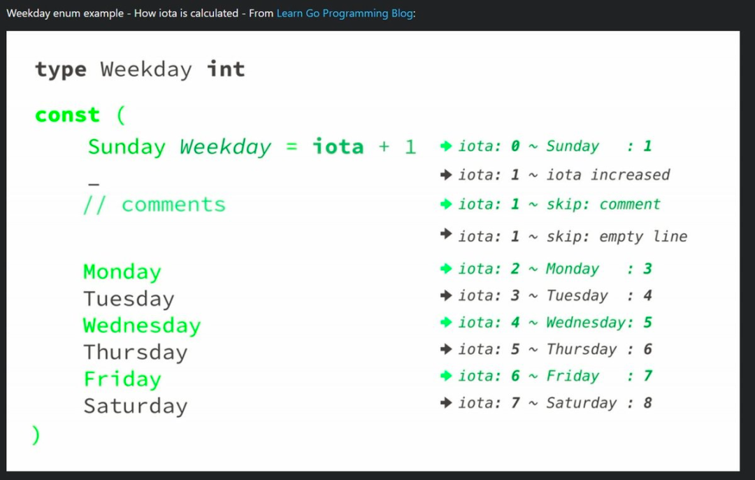 Sunday所在行iota=0,表达式是iota + 1,所以Sunday=1。_所在行iota=1,隐式重复表达式iota + 1,所以值为1 + 1 = 2。Monday所在行iota=2,隐式重复表达式iota + 1,所以值为2 + 1 = 3。...以此类推。