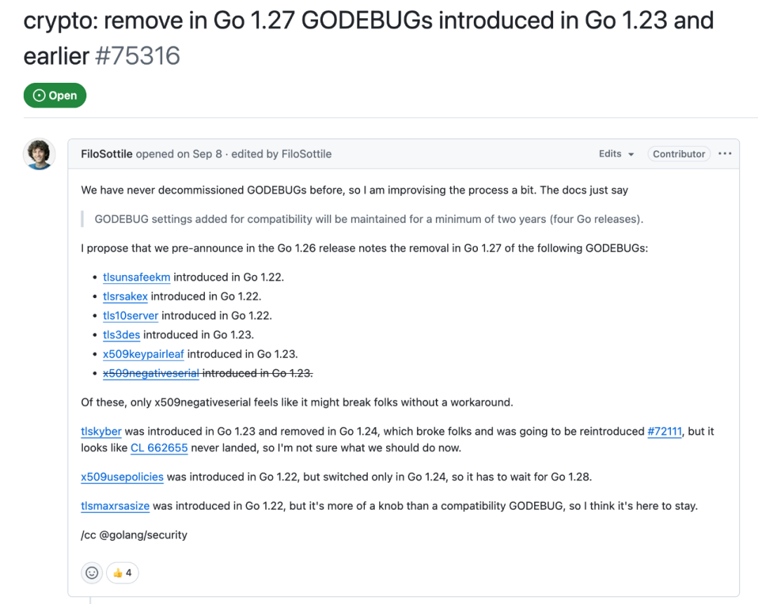 因此,Go 团队有强烈的动机去逐步移除那些不再必要的 GODEBUG 标志,但前提是:不能对开发者生态造成过度的破坏。