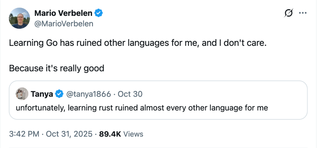 近日,一条开发者 Mario Verbelen 发布的推文——“学习 Go 毁掉了我钟爱的其他语言,但我不在乎。因为它真的太棒了。”——意外地在技术圈引起了一场关于 Go 语言的集中讨论。上百的开发者涌入评论区,分享着他们与 Go 的“爱恨情仇”。这场热议如同一面镜子,清晰地映照出 Go 在 2025 年的开发者心中究竟占据着怎样的位置。