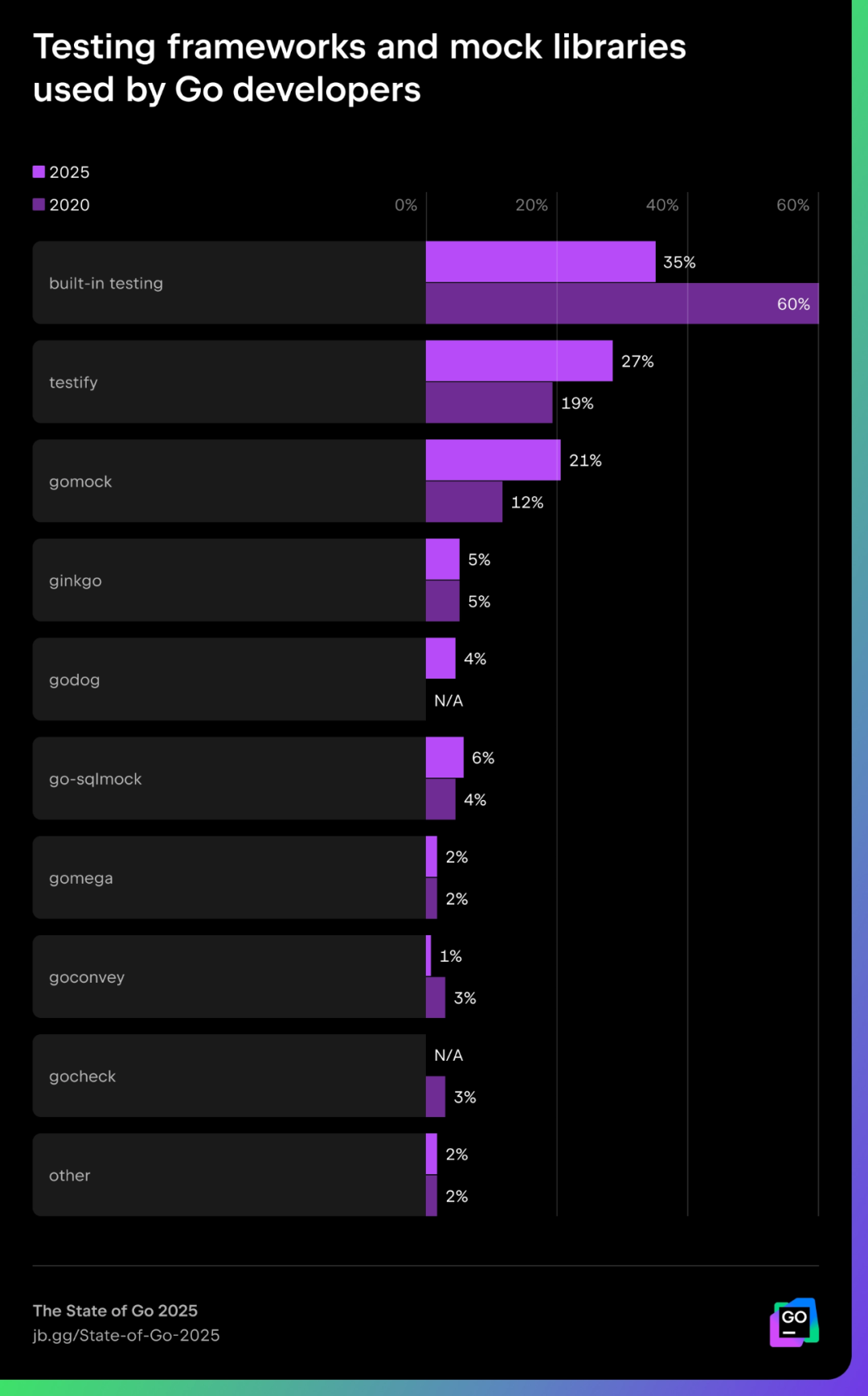 testify成为断言事实标准:testify的使用率从 19% 增长到 27%。其提供的丰富、易读的断言函数(如assert.Equal,require.NoError),完美地弥补了标准库在这一领域的空白。gomock成为 Mocking 核心选择:gomock的使用率从 12% 飙升至 21%。在 Go 这种面向接口编程的语言中,一个强大、易用的 Mocking 框架,对于编写可维护的单元测试至关重要。