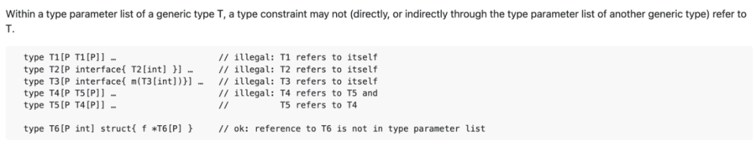 答案隐藏在编译器的类型检查和循环检测机制中。在早期,Go 的类型检查器为了防止无限递归(例如 type T T),采用了一套相对保守的循环检测算法。当它遇到 type T[P T[P]] 这种通过类型参数列表形成的“循环依赖”时,会直接将其误判为非法的无限递归。