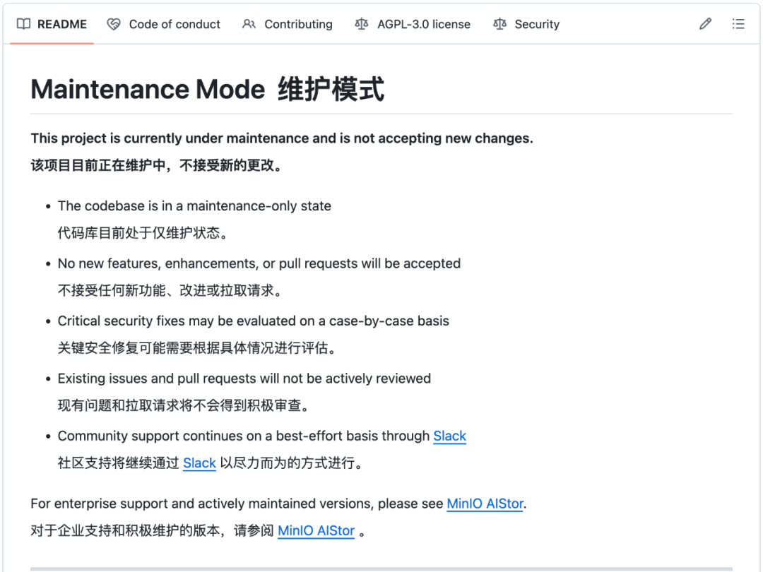 近日,GitHub 上拥有近 60k Star、Go 语言生态中最著名的开源对象存储项目——MinIO,悄然修改了其README。这一行看似平淡的声明,标志着 MinIO 开源版实际上已经被宣判了“死刑”。