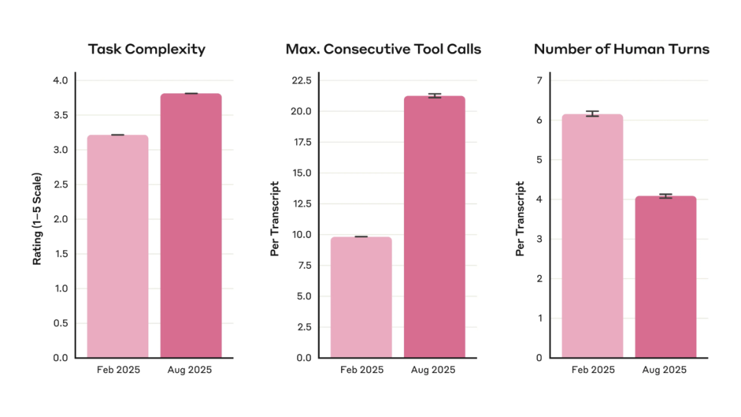 Agentic(自主智能体化)能力的飞跃:六个月前,Claude Code 平均只能连续执行 10 个操作;现在,它可以自主完成约 21.2 个连续的工具调用(如编辑文件、运行测试、修复错误),期间无需人类干预。