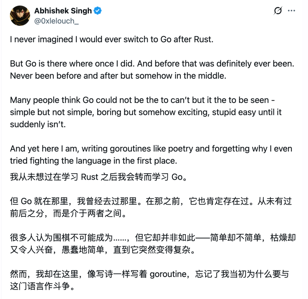 近日,开发者 Abhishek Singh 的一条推文,以其独特的、充满“诗意”的笔触,在开发者社区引发了广泛的共鸣和讨论。这句自白之所以令人惊讶,是因为它描绘了一条在很多人看来“不可思议”的技术迁徙路径:从 Rust——一门以其严谨、强大、表达力丰富著称的现代语言,转向 Go——一门在许多人眼中“简单”、“啰嗦”甚至“无聊”的语言。