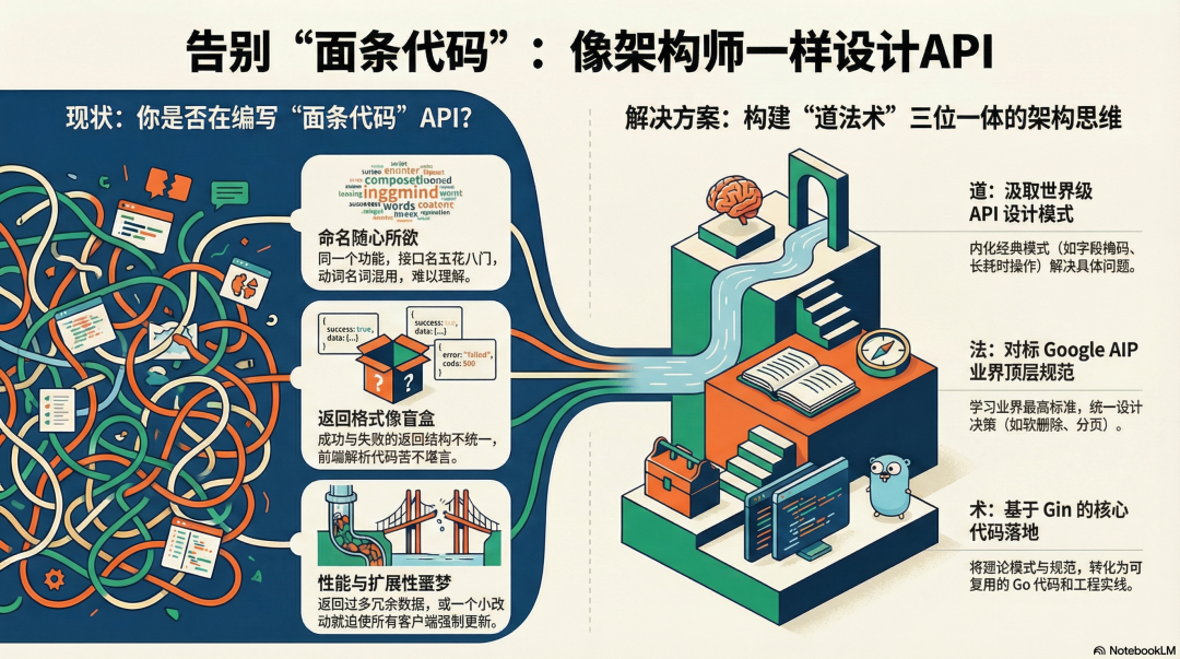 而本专栏《API 设计之道:从设计模式到 Gin 工程化实现》,试图走一条不同的路。我想带你打通从理论模式到工业标准,再到工程落地的完整闭环。