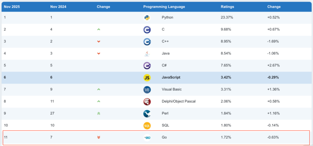 在老牌的 TIOBE 指数2025年11月份数据中,Go 从去年的第 7 名下滑至今年的 第 11 名,跌出了前十。这似乎是一个危险的信号。