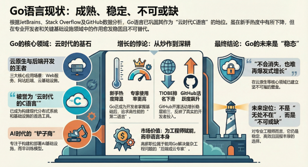 它不会取代 Python 或 TypeScript 成为统治一切的通用语言。它正在进入一个“稳态”。在云原生、后端服务和基础设施领域,Go 已经建立了坚不可摧的壁垒。对于追求职业发展的工程师而言,它依然是一个稳定、高效且回报丰厚的选择。