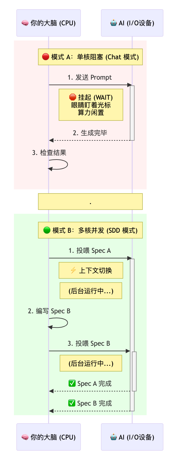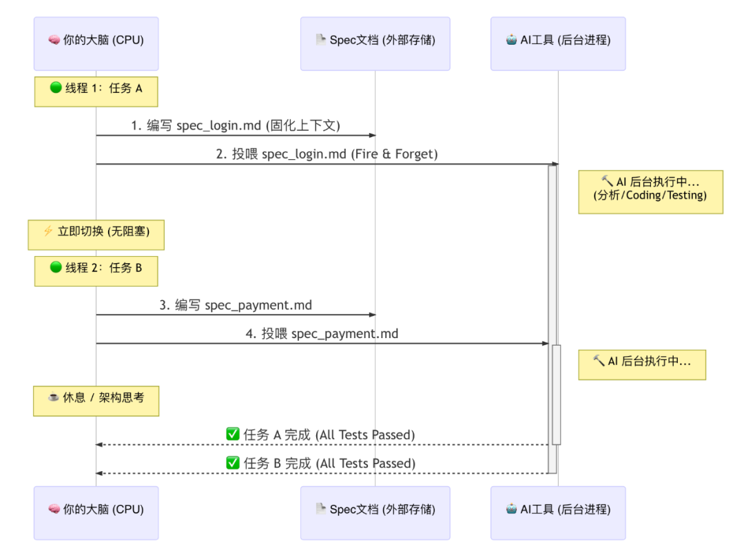 优势: 图中绿色的区域显示,当 AI 在后台“搬砖”时,你的大脑立刻切换(Switch)到下一个任务(编写 Spec B)。