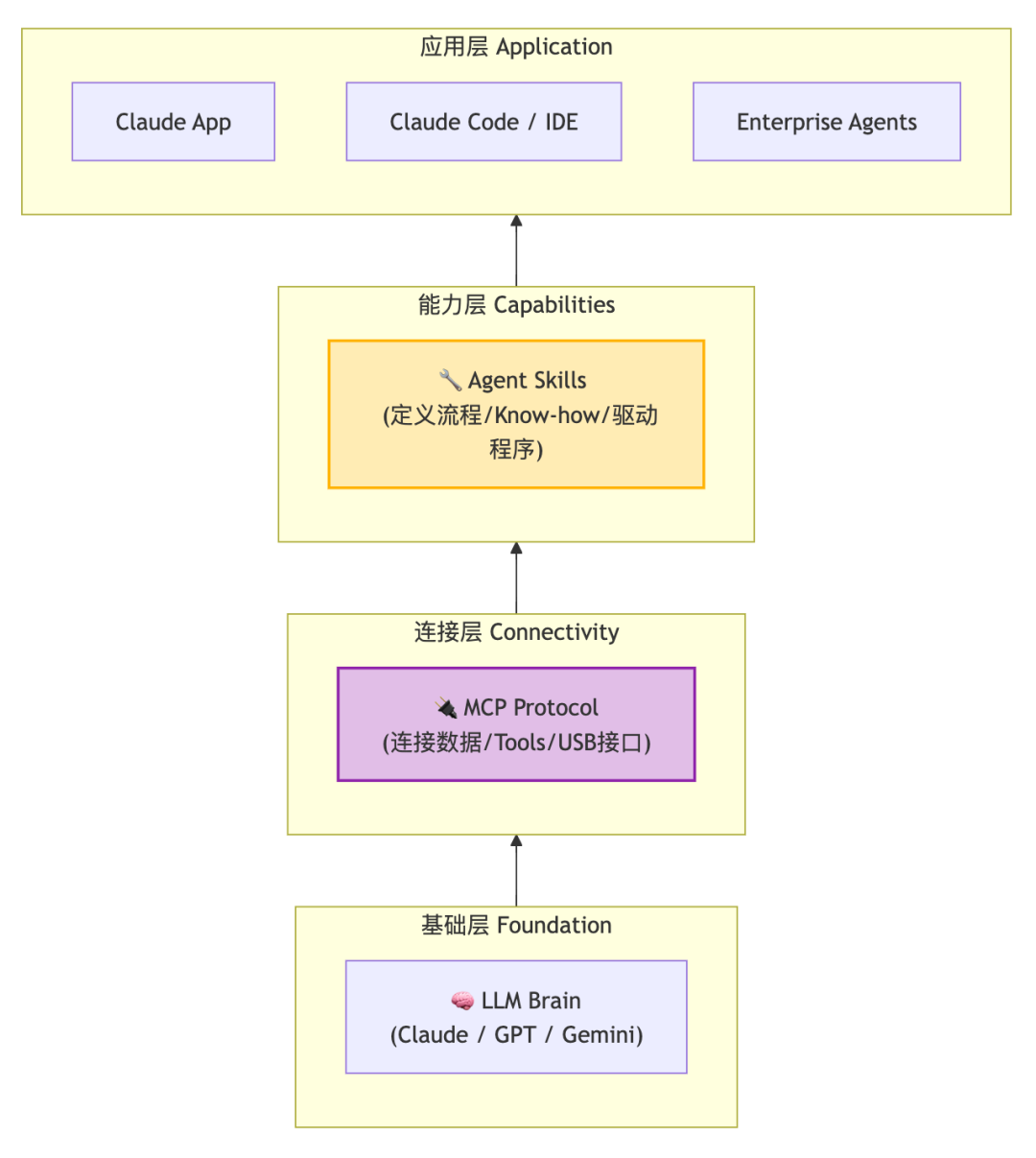 随着 Agent Skills 的发布,AI 原生应用的架构分层终于清晰了。我们可以用一张图来看懂这个全新的生态栈: