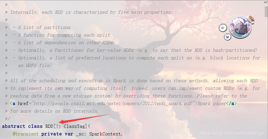 这里的特性,我们只是翻译过来的,真正的特性我们可以在源代码中找到,按ctrl+n+n,然后搜索RDD,我们可以看到这样一个描述: