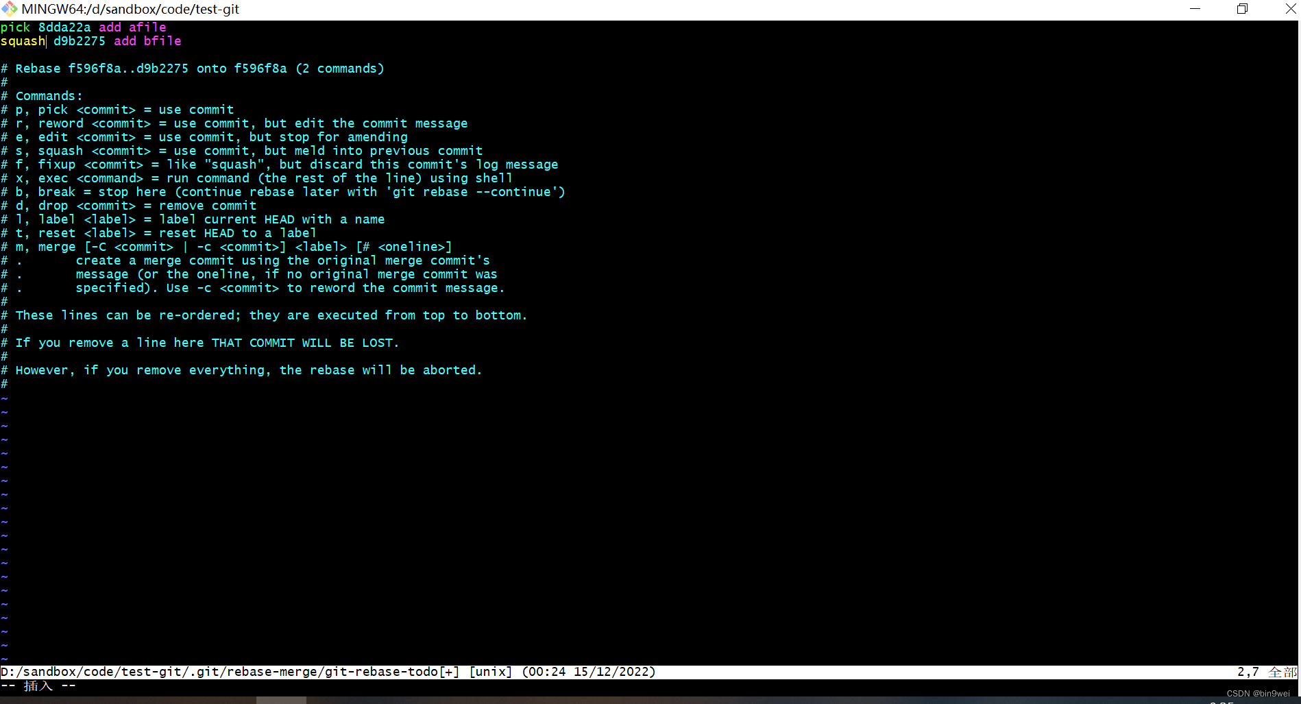 键盘按i键进入编辑模式,删除squash的那条commit message, 修改pick的那条commit message,键盘按Esc,然后按:wq,回车