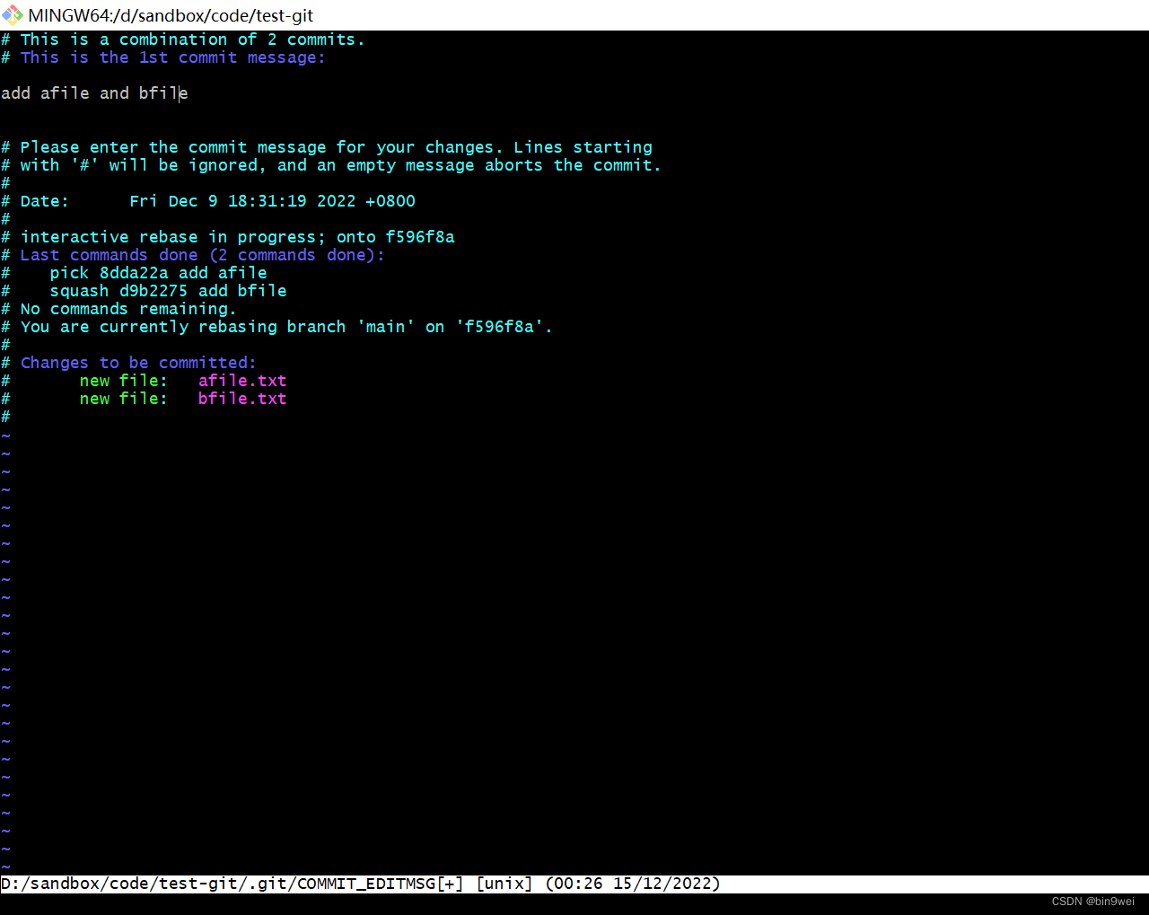 场景:我commit了afile,然后commit bfile,并且push到远程仓库了,其实它们属于同一个feature,这时想合并它们。
