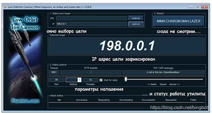点选择目标将允许攻击者专注于特定目标(输入站点的IP地址或URL),点攻击选项将允许您从三个TCP,UDP和HTTP中选择受攻击的端口,协议(方法)。在TCP / UDP消息字段中,您可以为攻击者输入消息。在完成攻击之后,它开始按下IMMA CHARGIN MAH LAZER按钮这就就是使用的全部。
