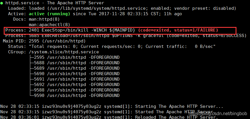 同样的是纠结了我好长一段时间的是,刚开是的时候httpd是能正常解析php文件的,但有段时间我把httpd服务给kill掉过后,由于不甘心又去配置Nginx,还是老样子,就又回来启动httpd,这时连httpd也都不能解析php文件了,只能访问html静态文件。而且还出现了些异常现象,后来仔细检查,在#systemctl status httpd中看到了下面错误,提示进程Process:2401启动失败。想着可能PID为2401的端口被占用,#netstat -anp --查看所有端口情况,当然没找到占用情况(无语加崩溃)。后来重启实例,重启httpd,竟然好了,(想着可能是进程启动失败或端口占用原因,我还清过缓存。具体原因还在不断摸索中,在此作个记录。)