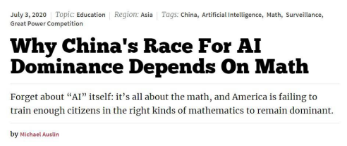 作为当代教育最重要的基础,数学水平太差引发各国的担忧。在亚洲人数学很差的视频被流传时,美国《国家利益杂志》却给出完全相反的观点,即表示由于中国人数学好,进而使得中国才能在人工智能领域里逐渐成为决定性力量。