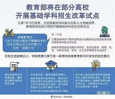 今年1月,教育部发布了强基计划,即是为国家选拔培养有志于服务国家重大战略需求且综合素质优秀或基础学科拔尖的学生;5月6日参与强基计划的大学已经发布了第一年的招生简章并开展试点……