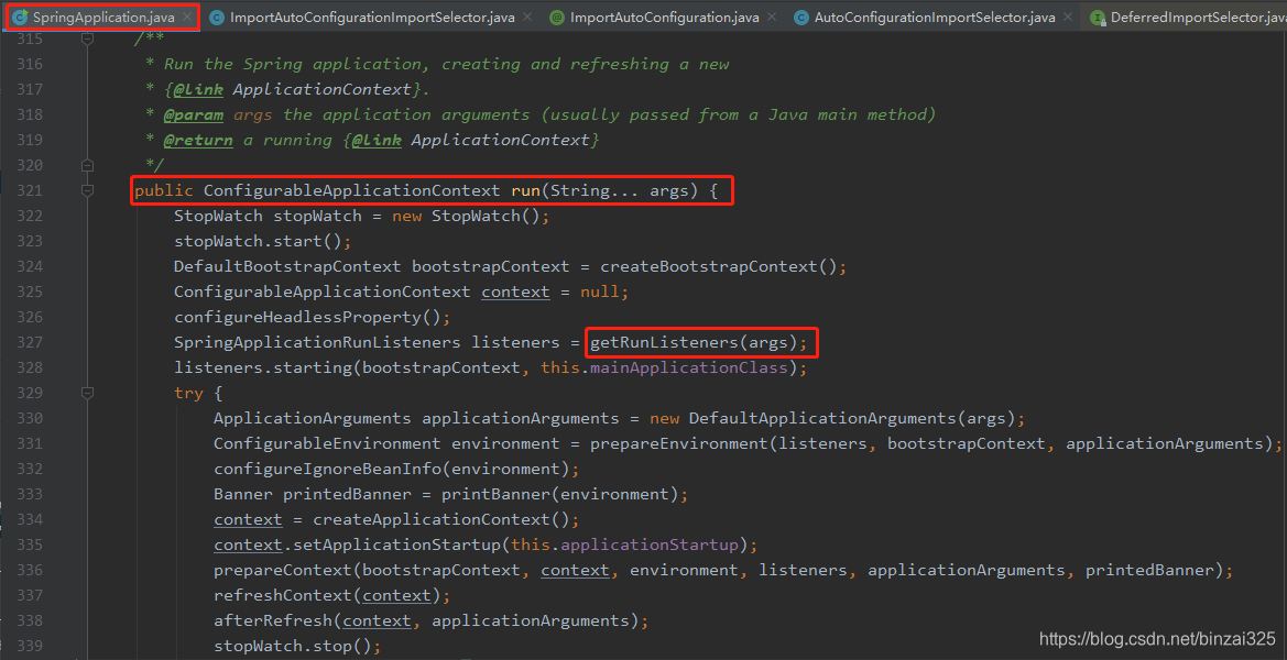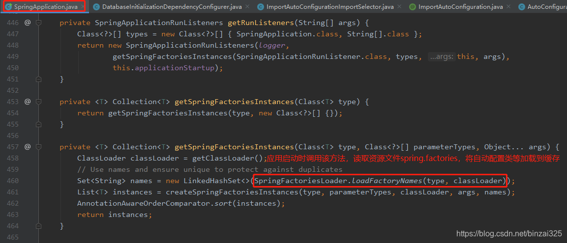 查看源码,发现SpringApplication.run(...) 调用 getRunListeners(...) 调用 getSpringFactoriesInstances(...) 调用 SpringFactoriesLoader.loadFactoryNames(...),读取资源文件spring.factories,将自动配置类名加载到缓存中