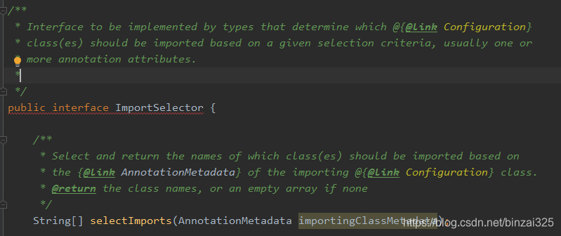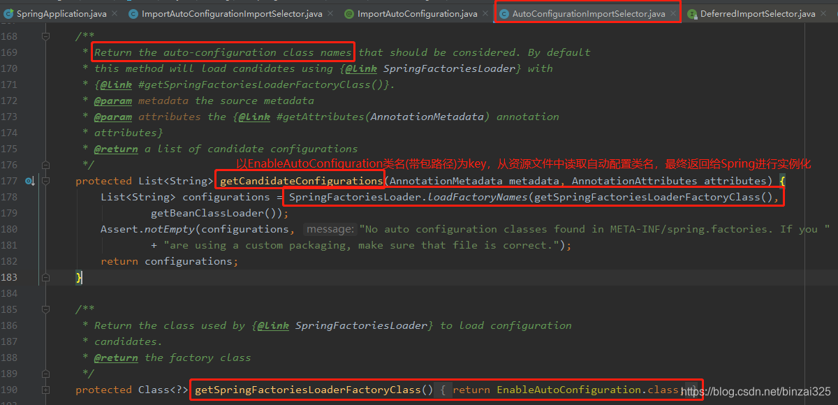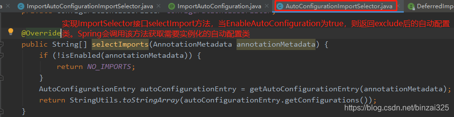 org.springframework.boot.autoconfigure.AutoConfigurationImportSelector实现了org.springframework.context.annotation.ImportSelector接口。Spring会调用ImportSelector接口selectImports方法获取需要实例化的自动配置类,并进行自动配置。