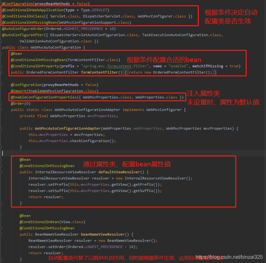 自动配置类(****AutoConfiguration)作用:替代了以前XML的功能,同时能根据条件生效,达到自动配置的效果。根据条件配置bean、同时根据属性类(****Properties类)设置bean的属性值。