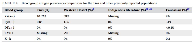 提维岛民由于遗传隔离形成了独特的血型抗原分布特征,与澳大利亚主要献血群体(高加索人种)存在显著差异,在输血过程中容易引发同种免疫反应。面临着因血型抗原多态性导致的输血风险。